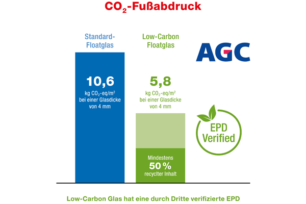 Bei der Herstellung von Low-Carbon Floatglas wurde der gesamte Fertigungsprozess vor und während der eigentlichen Fertigung bis hin zur Auslieferung an die Kund:innen betrachtet, um Treibhausgase zu reduzieren. Das Ergebnis ist ein kohlenstoffarmes Floatglas mit einem reduzierten Kohlenstoff-Fußabdruck von 5,5 kg CO2-eq/m2** bei einer Glasdicke von 4 mm, was eine Reduktion von über 45 % ermöglicht.